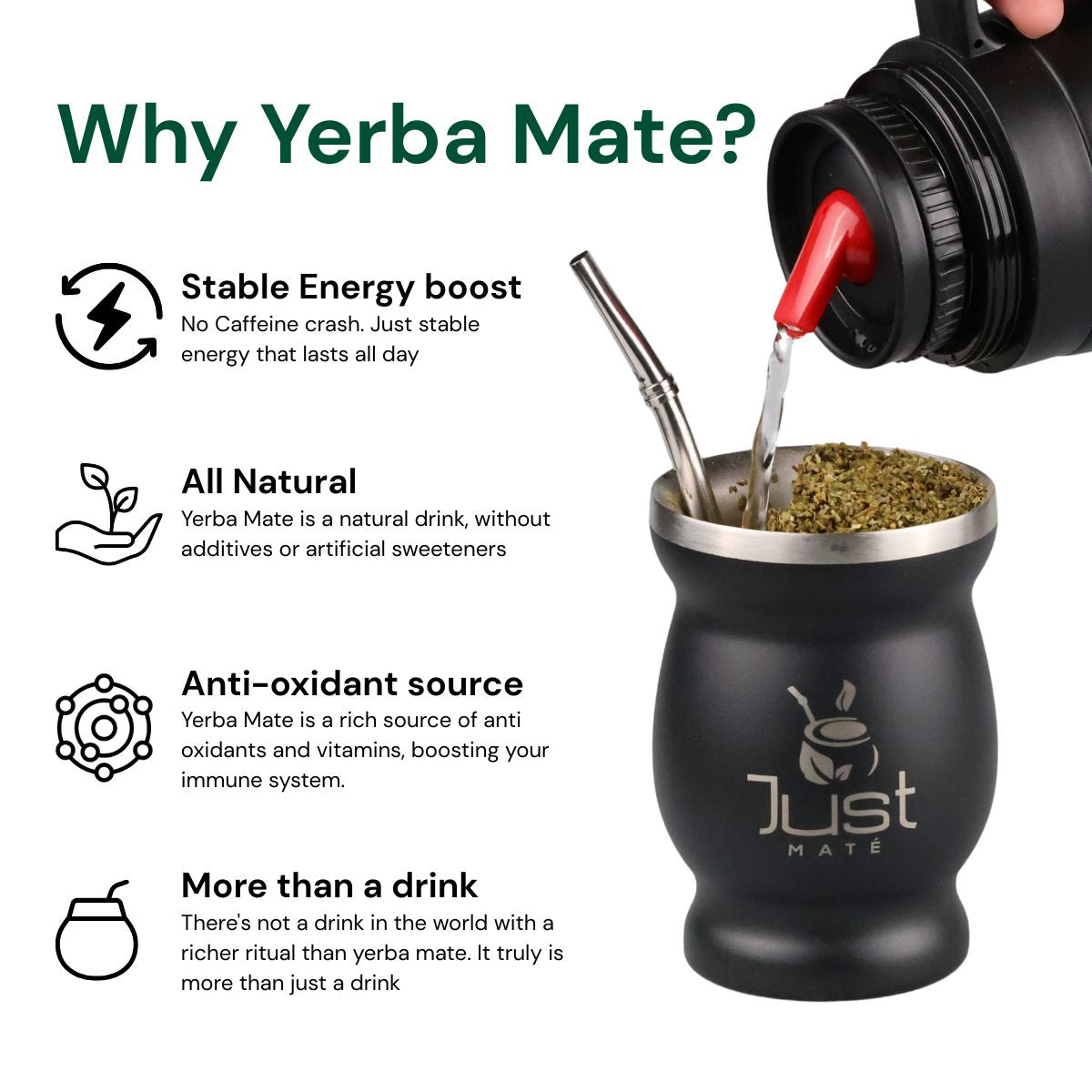 Ontdek de rijke smaak en traditie van Yerba Mate met onze Just Maté Standaard Starterspakket! Deze kit is perfect om mee te beginnen en bevat precies wat je nodig hebt om van yerba mate te kunnen genieten.